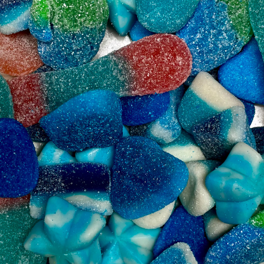 cukor, glükózszirup, invertcukorszirup, zselésítőszer: zselatin, pektin; keményítő, módosított keményítő , maltodextrinek, dextróz, savak: citromsav, borkősav , tejsav, almasav, ecetsav; hidrolizált rizsfehérje, burgonyafehérje, nedvesítőszer: glicerin, szorbitok; almalé koncentrátumból; savasság-requlátor: nátrium-citrátok, nátrium-malátok; fényezőanyag: karnaubaviasz, méhviasz ; zöldségkoncentrátum: citrom, pórsáfrány, sárgarépa, feketeribizli, retek, sütőtök, alma, paradicsom, édesburgonya, cseresznye, spirulina, hibiszkusz, bodza; olívaolaj aromák , színek: lásd bélyegző. Zselés drazséhoz: sűrítőszer: arab gumi; fényezőanyag: sellak.Nyomokban tejet tartalmazhat, savanyú anyagok: E330, E296. E270. pektin. színezékek: E102, E133. E102